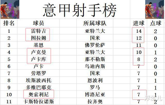 在弓手榜的情况上,雷特吉至本日告成打进一球,如斯一来,他便把率先的上风进一步扩大到了2球之多沙巴体育网体育信息,而图拉姆凭借12个进球的得益位居第2名。值得一提的是,卢克曼也告成破门得分,就此成为了本赛季第4个进球数目达到两位数的球员。另外,卢卡库在打入那要道的绝杀一球后,以8个进球的得益独自排在第5的位置。还有奥索利尼,他凭借着7个进球追上了劳塔罗等东谈主,恰巧拥入了弓手榜的前十行列之中。