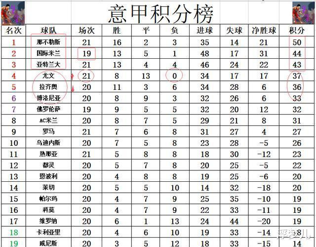 在积分榜的情况上,亚特兰大本日遇到了逆转绝杀,如斯一来,近4轮赛事里他们获得了3平1负的战绩,连结4轮都没能告成,就这么沦为了第3支掉队的军队。如斯发展下去,当今的争冠样式只怕就要酿成那不勒斯和国米二者互相争霸的方位。那不勒斯在赢下比赛之后,由于多赛了两场,凭借着6分的上风稳稳地压过国米,处于领跑的位置,这一下压力可就全到了国米这边。再看尤文,本日干净利落地完胜了AC米兰,依旧保持着不败的考究态势,并且因为先进行比赛,暂时特出拉都奥1分,告成置身到前4的行列之中。另外,博洛尼亚在赢球之后,也到手地特出了AC米兰以及佛罗伦萨,排名高潮至第6位。