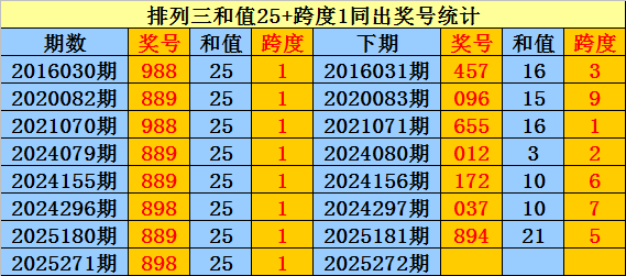 陈设三近8次和值25+跨度1同出时奖号为:988、889、988、889、889、898、889、898,下期分离出现:457、096、655、012、172、037、894。