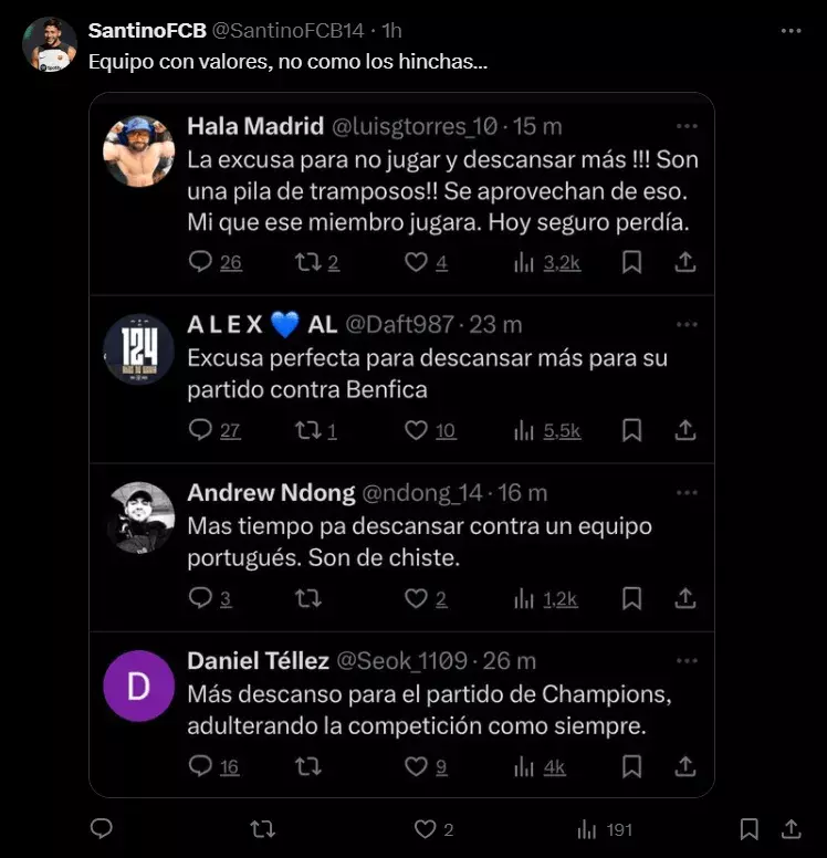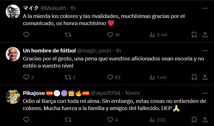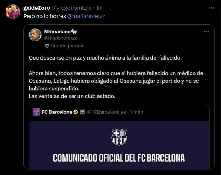 巴萨一线队队医卡莱斯在当地技巧中午弃世,巴萨本轮对阵奥萨苏纳的联赛也因此推迟。 皇马时尚姆巴佩在得知后也在个东说念主社媒发布了动态默哀:“安息吧,卡莱斯。” 在巴萨队医卡莱斯离世后,多家西甲和西乙俱乐部齐发文默哀。其中就包括巴萨的老敌手皇马。 “皇家马德里足球俱乐部、其主席及董事会对巴塞罗那足球俱乐部医师卡莱斯-米尼亚罗-加西亚的弃世深表哀痛。 皇家马德里足球俱乐部谨向他的悉数家属、共事、巴塞罗那足球俱乐部及悉数亲东说念主抒发慰问和原宥。 愿他安息。” 而在皇马的默哀声明下,多位巴萨球迷也抒发了他们的感谢。 “感情和厌烦齐一边去。感谢你们的声明。” “相配感谢你们的举动,但很缺憾你们的球迷并莫得达到这个水准。”  而上述的“你们的球迷并莫得达到这个水准”,指的是一些疑似皇马球迷在集中上关于巴萨比赛延期抒发不悦的言论。有球迷在抒发感谢之余,挂出了这些言论。 “你可别删啊。@marianoferzz”  而这位叫@marianoferzz的挂着穆里尼奥头像的网友原文这样写说念:“但愿他安息,愿骸骨家属原意。那么问题来了,咱们齐很明晰要是死的是奥萨苏纳的队医,LALIGA会将就奥萨苏纳继续比赛,而不是延期。这便是算作国度俱乐部的克己。” 另别称球迷则放出了另一张截图,同期配文说念“有准则的俱乐部,没水平的球迷”。  而在截图中不错看到别称皇马球迷的言论。 Hala Madrid:“不思比赛多休息的借口落幕!一群舞弊的家伙!他们哄骗了这件事。这个队医又不上场。他们今天底本细则要输的。” 其他几位球迷(未知身份)的言论: “完好的借口来让他们踢本菲卡多休息。” “就思踢葡超队之前多休息,真实见笑。” “便是思欧冠前多休息体育集锦,一如既往地搅散联赛。”