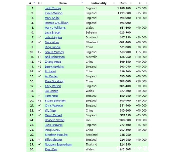 值得一提的是,7届世锦赛冠军“火箭”罗尼奥沙利文尽管在近期一再退赛体育录像/图片,由于前期的奖金积分相等高,依旧高居第四位。而其他中国选手方面,本赛季两次打进名次赛决赛的小将吴宜泽排在队22位,距离TOP16还有6位的差距。另外,庞俊旭、周跃龙、徐想、雷佩凡的天下名次也齐靠前。